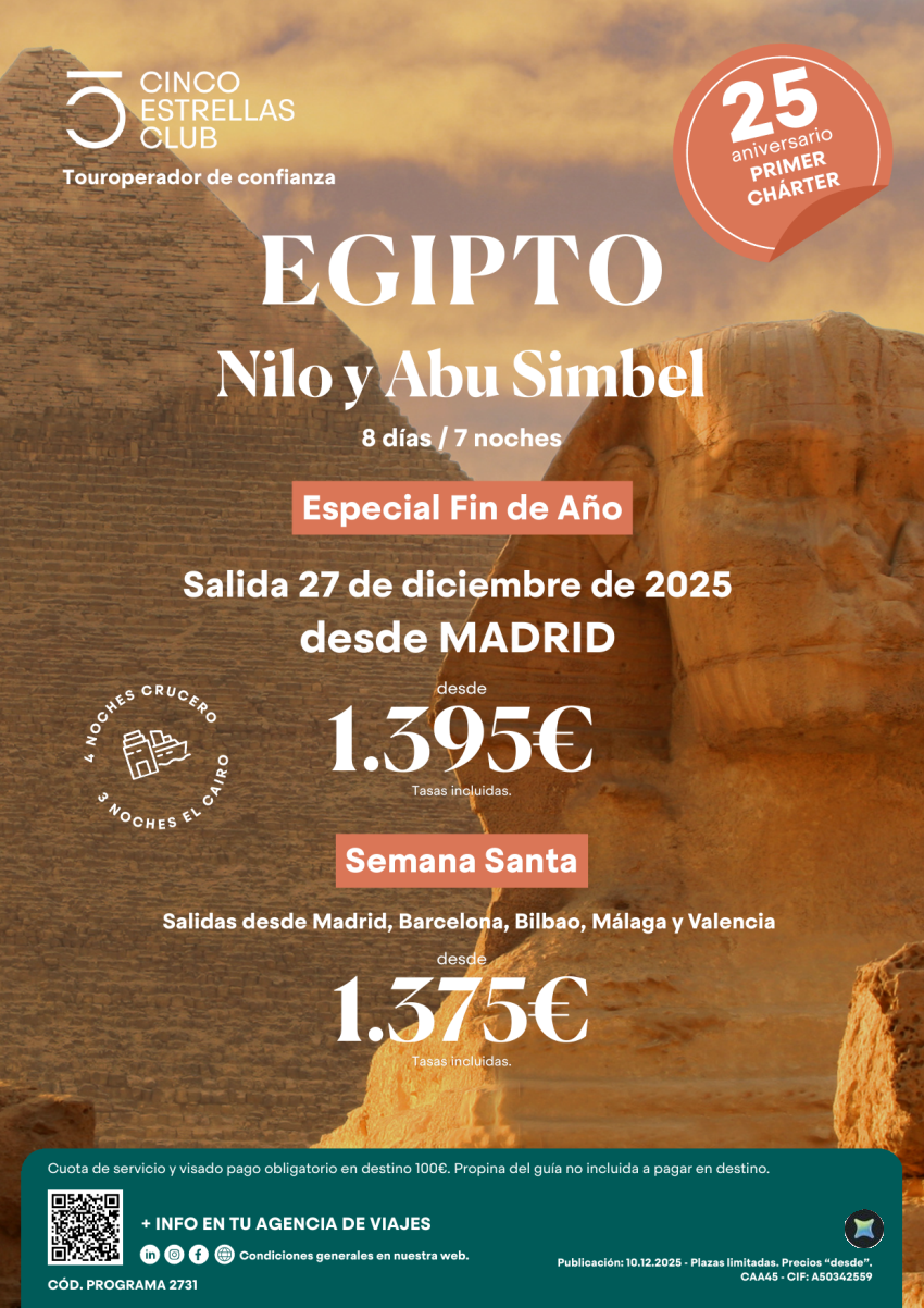 Últ. Plazas Esp.Fin Año Nilo y Abu Simbel 8ds/7ns pvp final 1.395€ salida 27 de diciembre desde MADRID.