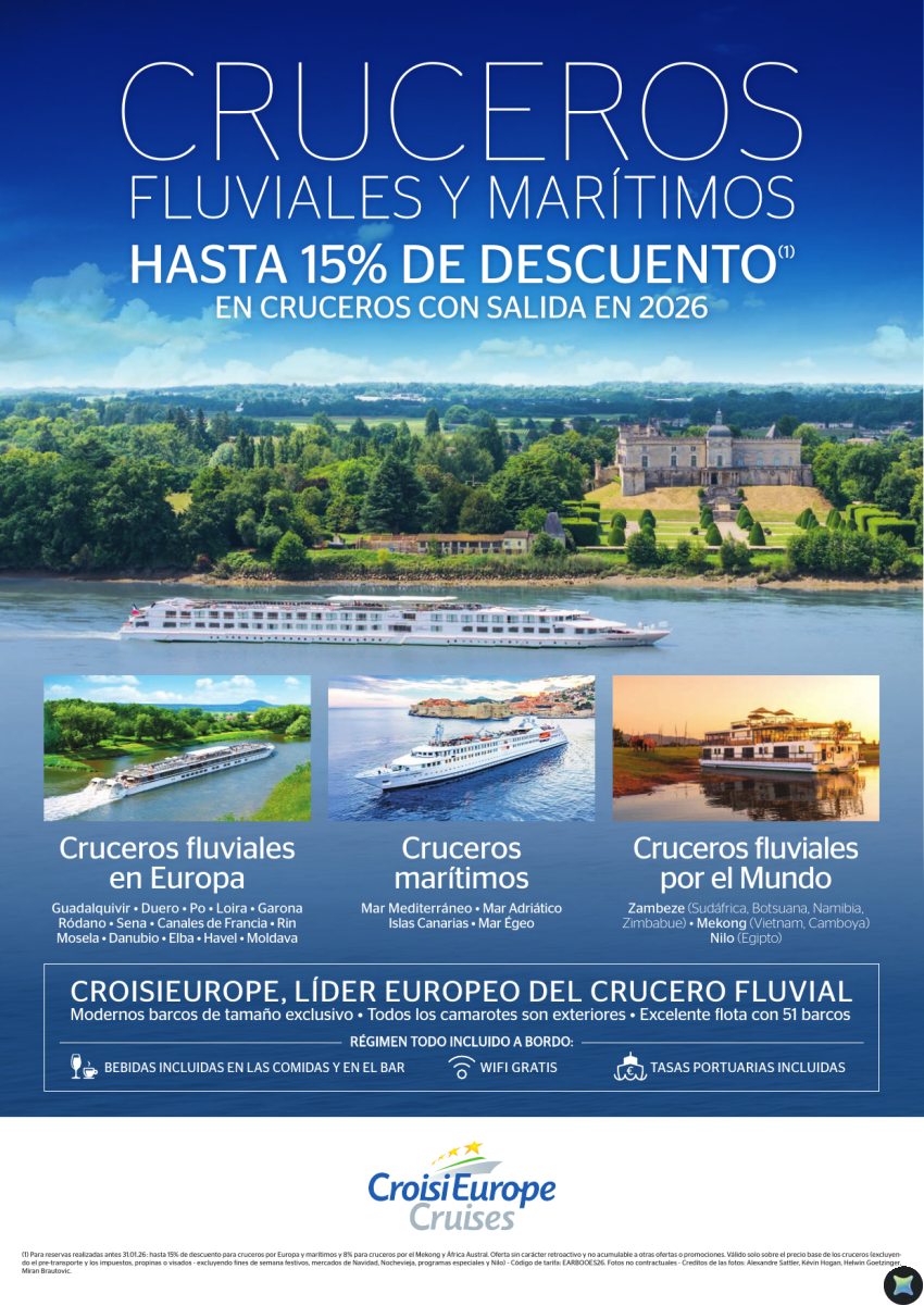 Hasta 15% DESCUENTO salidas 2026 - Cruceros fluviales y marítimos CroisiEurope
