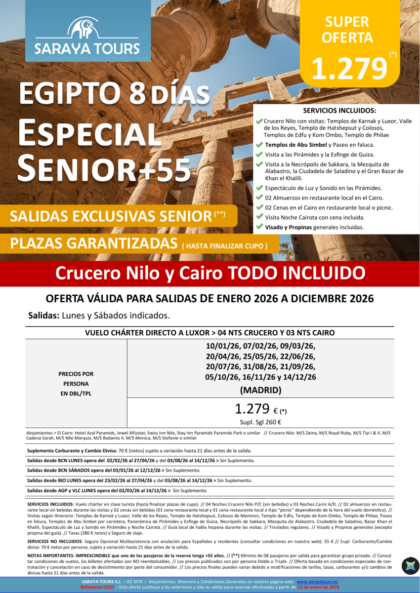 Especial Egipto Senior 8 días *Salidas Mad,Bcn,Bio, Agp & Vlc* Crucero y Cairo con visitas y mas! Hasta Dic26