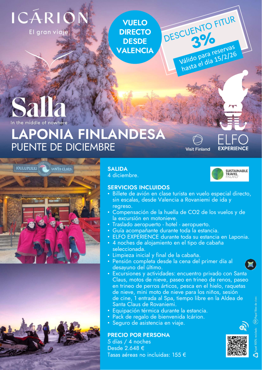 Puente de diciembre en Salla 4 diciembre. Descuento FITUR 3%. Válido hasta 15/02. Vuelo directo desde Valencia